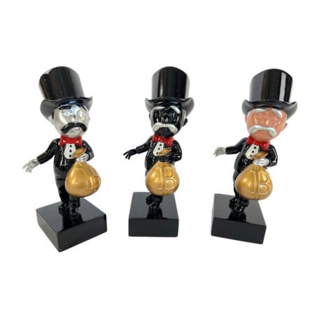 Ces figurines audacieuses représentent une version revisitée et moderne du célèbre personnage du jeu Monopoly, affublé de son traditionnel haut-de-forme, de son nœud papillon rouge pétant, et surtout… d’un gros sac doré du symbole Bitcoin (₿). Chaque statue repose sur un socle noir brillant, stable et élégant, mettant en valeur le
