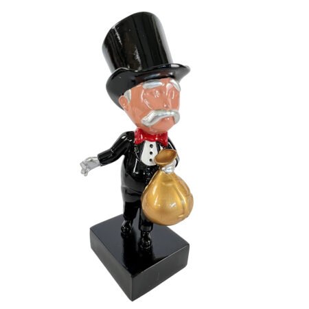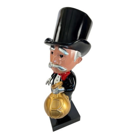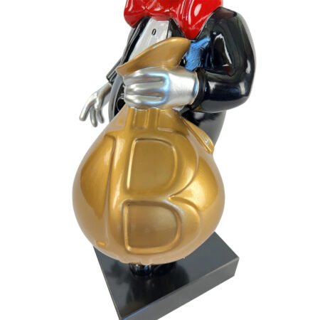 Cette figurine audacieuse représente une version revisité et moderne du célèbre personnage du jeu Monopoly, affublé de son traditionnel haut-de-forme, de son nœud papillon rouge pétant, et surtout… d’un gros sac doré du symbole Bitcoin (₿). La statue repose sur un socle noir brillant, stable et élégant, mettant en valeur le